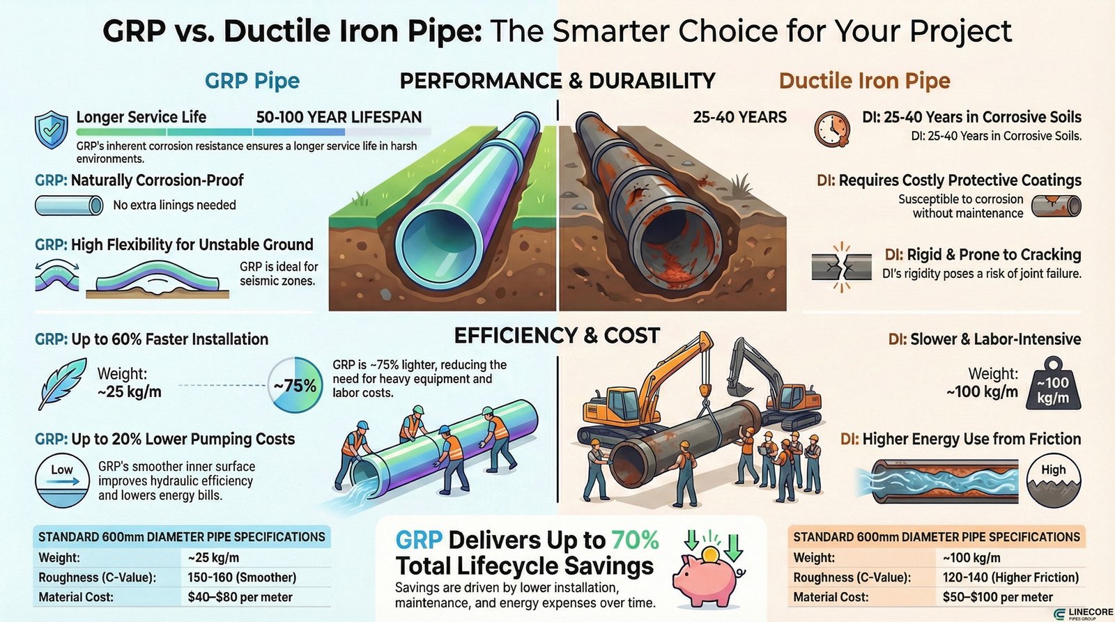 | Parameter | GRP Pipe | Ductile Iron Pipe |