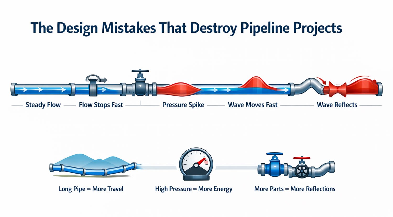 Most pipeline failures don’t happen during normal, steady design pressure. They hit during sudden transients. A water hammer is a powerful pressure wave that suddenly appears when flowing liquid stops or changes direction fast. For example, when a pump trips or someone closes a valve quickly.