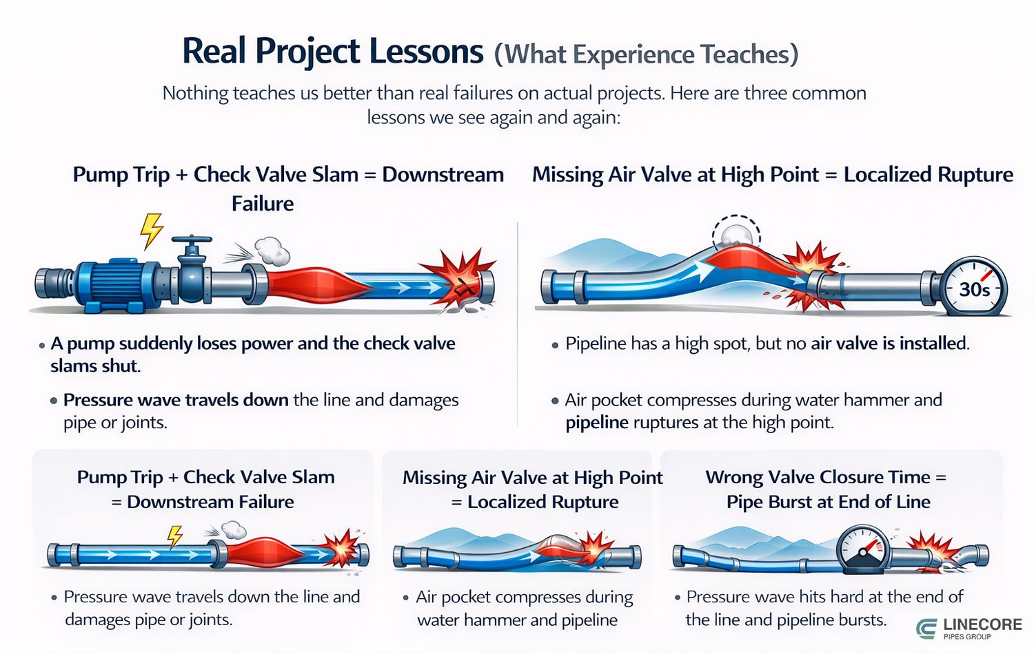 Water Hammer design mistakes infographic (source:Pipelinecoregroup.com)
