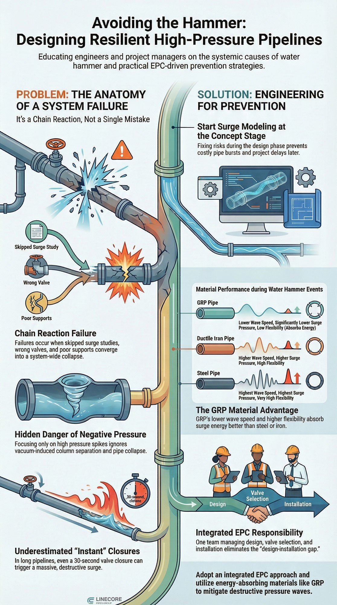 If you have a high-pressure pipeline project and want to protect it from water hammer, here is where you should stop. We, at LineCore Pipes Group, offer more than just pipes. We provide complete GRP pipeline solutions together with full EPC support.