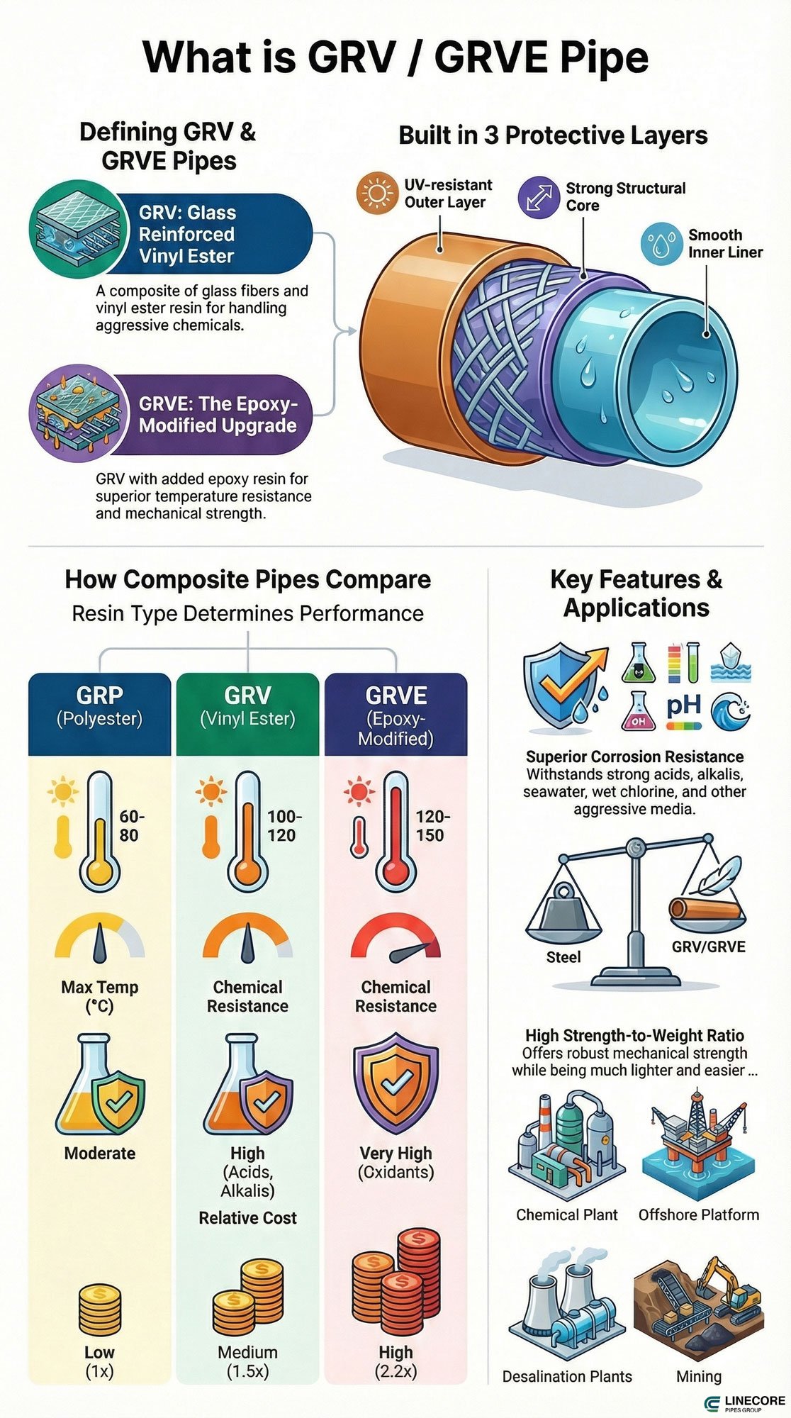 | GRVE | Epoxy-Modified Vinyl Ester | 120-150 | Very High (oxidants, aggressive media) | Extreme corrosives, mining, brine | High (2.2x) |