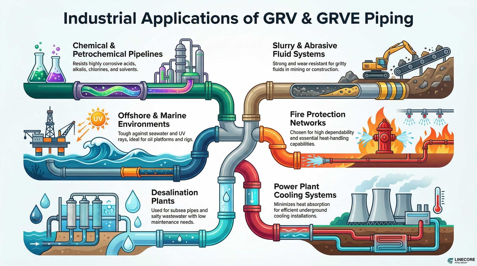 GRV pipes are used in chemical processing, petrochemical pipelines, desalination plants, wastewater treatment, offshore platforms, and fire protection systems.